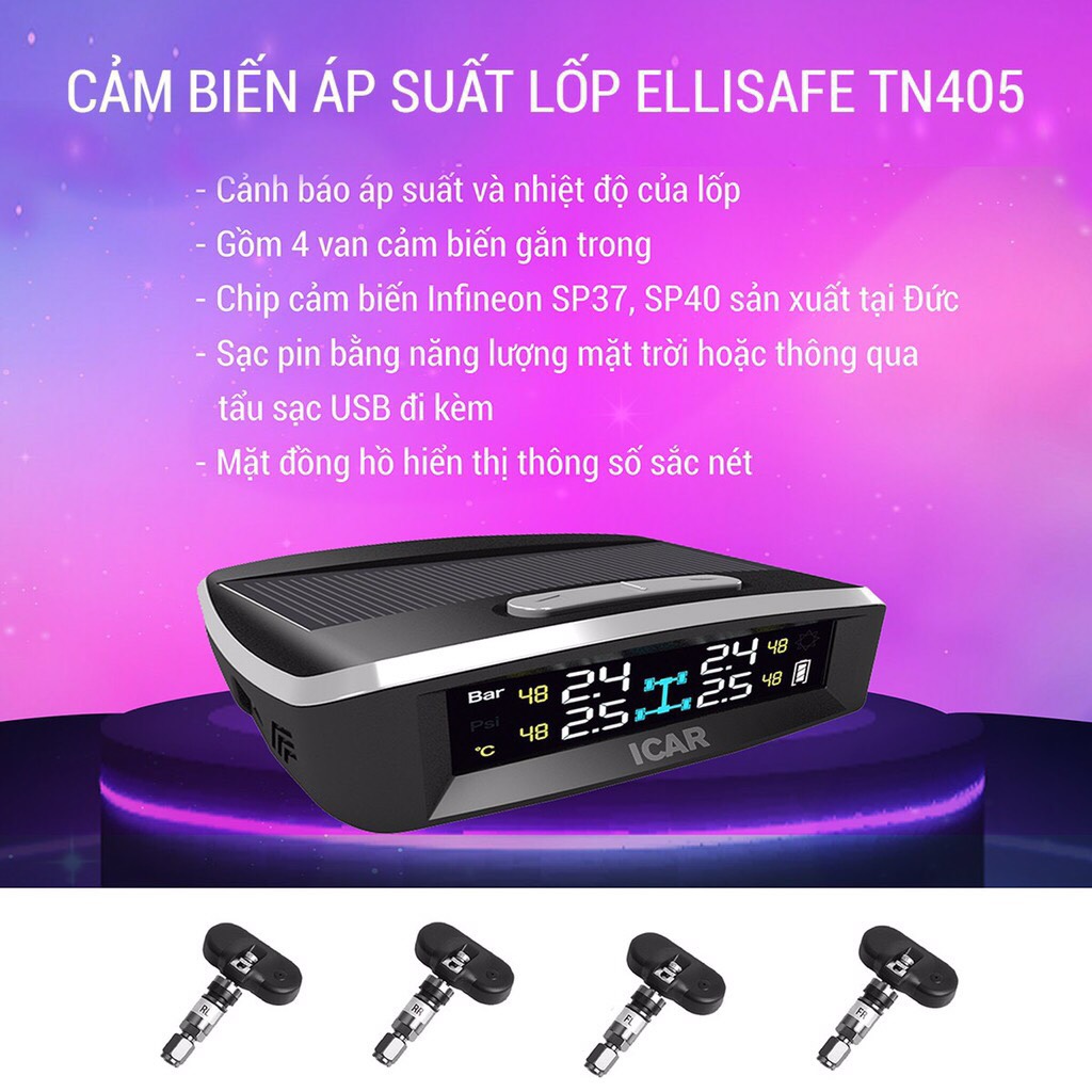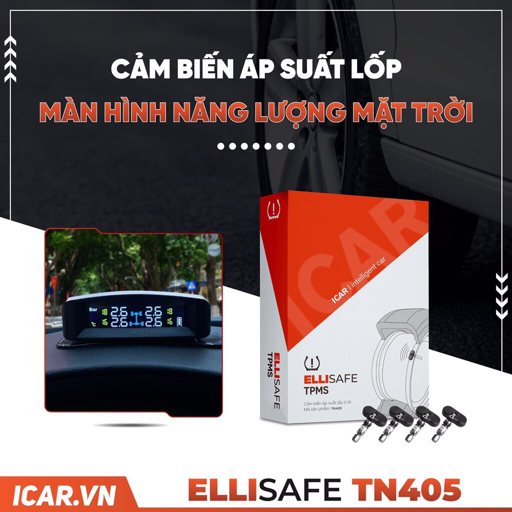 Mặt trước hộp đựng sản phẩm TN405 sẽ có những thông tin: Tên đơn vị cung cấp (ICAR Việt Nam), Tên thương hiệu (Ellisafe) Tên sản phẩm, Mã sản phẩm (TN405) in sắc nét, rõ ràng. Mặt sau hộp đựng sản phẩm cảm biến áp suất lốp có đầy đủ thông tin: Tên sản phẩm, mã sản phẩm, đơn vị nhập khẩu và phân phối, nhà máy sản xuất, mã code, website, thông số kỹ thuật.