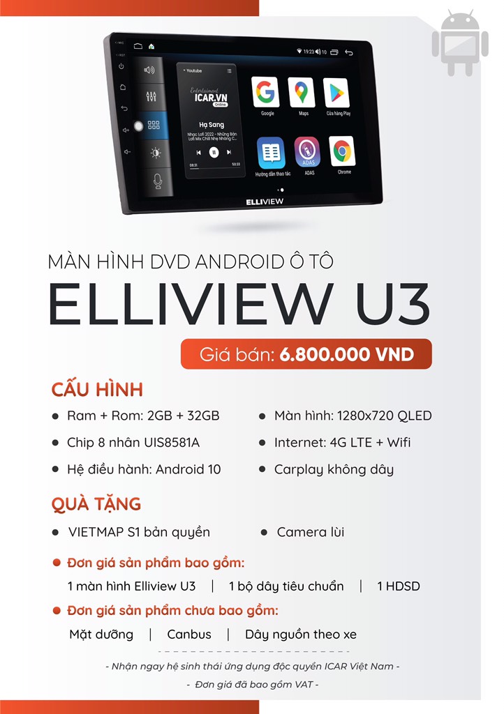 Sở hữu toàn bộ những tiện ích mà các dòng màn hình cao cấp khác của ICAR nhưng Elliview U3 chỉ có giá 5.800.000đ. Cơ hội sở hữu màn hình cao cấp, thông minh nhưng giá lại rẻ thì chỉ có thể là Elliview U3 của ICAR Việt Nam.